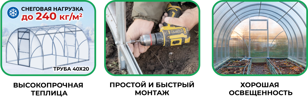 ✅Выбор прочности. Прочность каркаса зависит от количества дуг. Есть возможность ухаживать за теплицей зимой? Тогда выбирайте расстояние между дугами 1 метр. Такая конструкция обойдется дешевле и выдерживает 180 кг/м2. Если расстояние между дугами будет 67см, снеговая нагрузка на каркас вырастет до 240 кг/м2. В любой комплектации дуги сделаны из прочной оцинкованной трубы 40х20 мм.